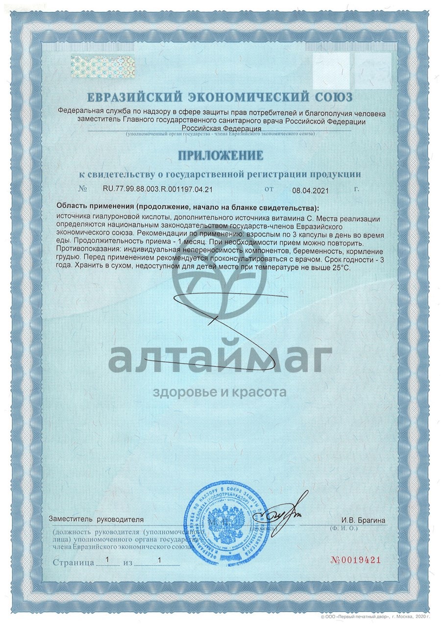Гидролизат рыбного коллагена, гиалуроновая кислота, витамин С (L-Аскорбиновая кислота). Вспомогательные вещества: антислеживающие агенты тальк, кремния диоксид, капсула (гидроксипропилметилцеллюлоза)Способ применения