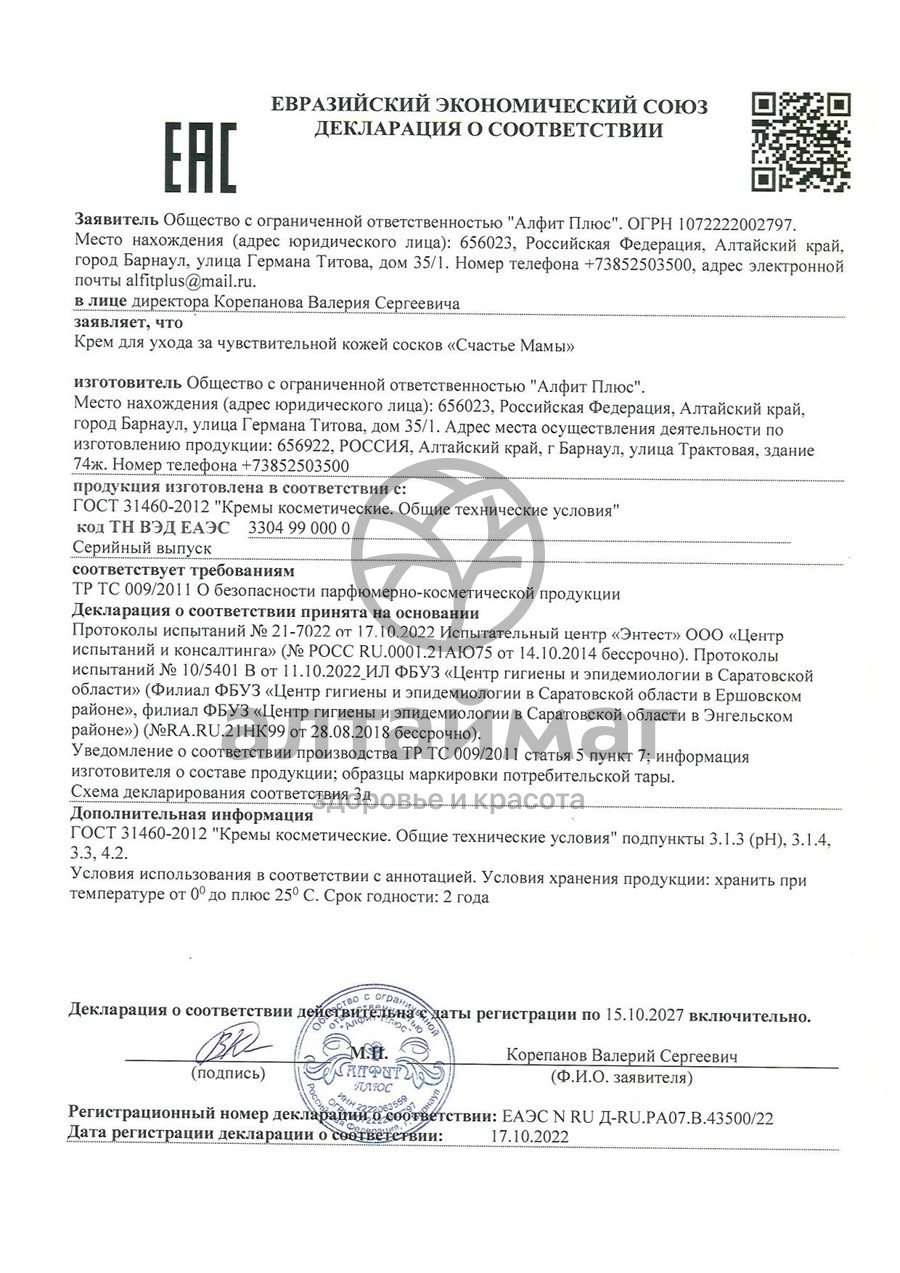 Есть вопросы по товару "Крем для сосков Счастье мамы Алфит 25мл"?