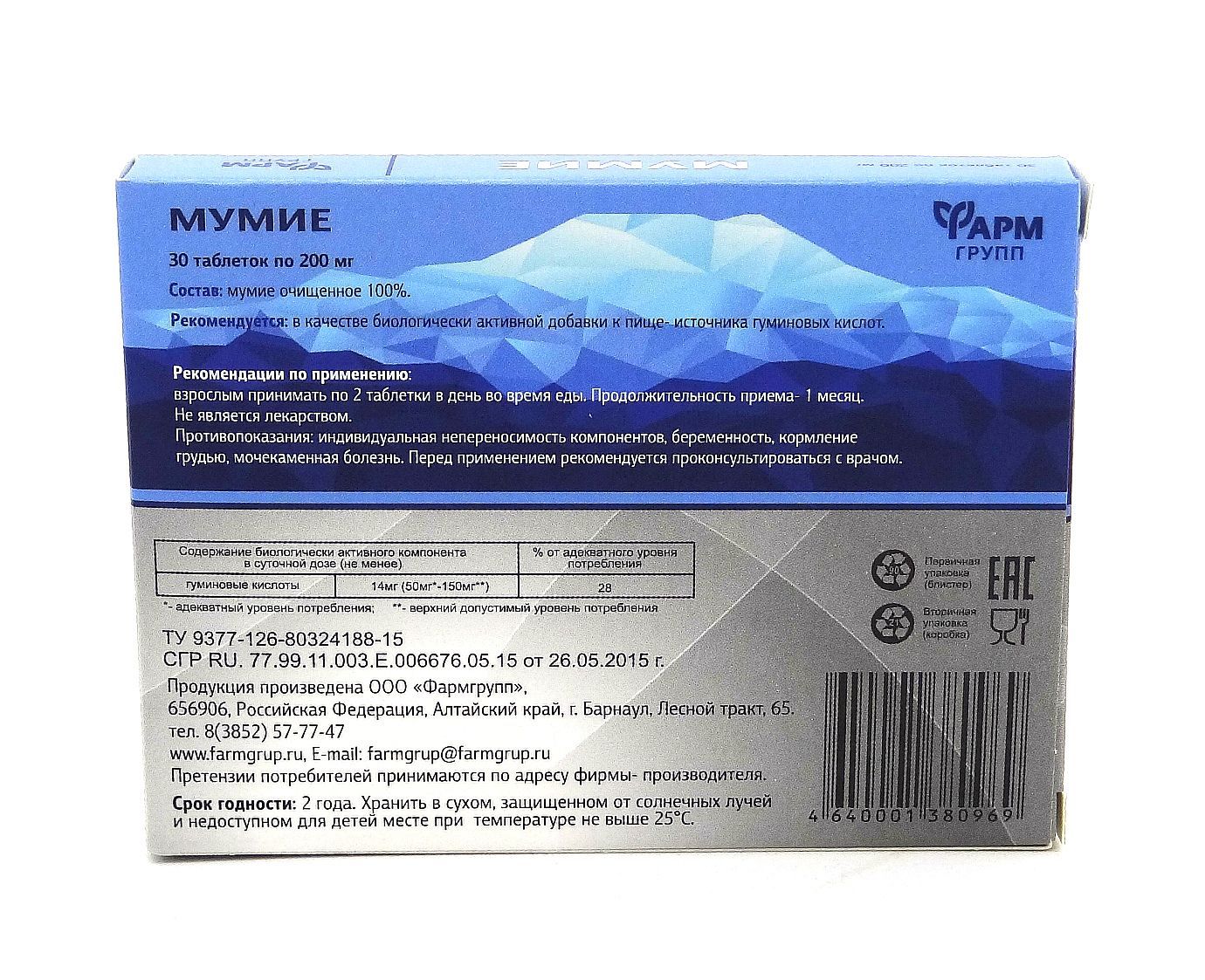 Алтайское мумие в таблетках. Обладает широким спектром действия: является общеукрепляющим, детоксицирующим, противовоспалительным и бактерицидным средством, улучшает обмен веществ, стимулирует регенеративные процессы и т. д.