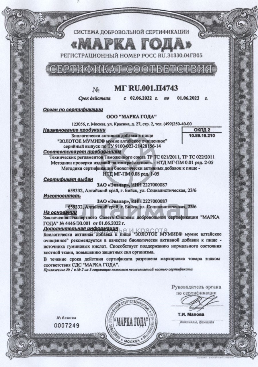 Золотое мумие от компании Эвалар – это 100% очищенное алтайское мумие, изготовленное по оригинальной технологии, которая позволяет максимально сохранить активно действующие вещества: витамины, аминокислоты и более 30 микро- и макроэлементов с высокой биодоступностью. Настоящий золотой стандарт алтайского мумие!