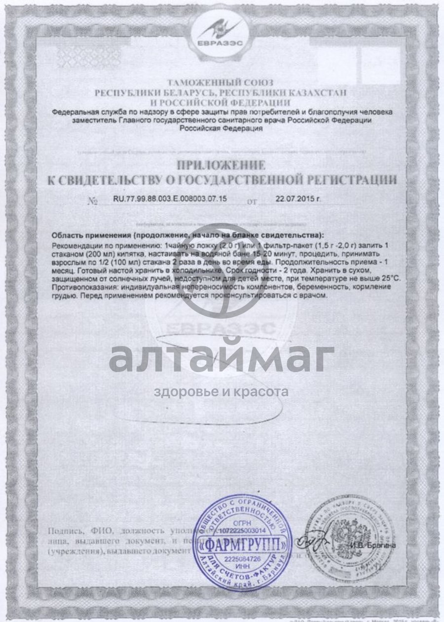 1 фильтр-пакет (1,5-2,0 г) залить 1 стаканом (200 мл) горячей воды, настоять на водяной бане 15-20 минут, процедить, принимать взрослым по ½ стакана (100 мл) 1 раз в день во время еды. Готовый настой хранить в холодильнике. Продолжительность приема – 1 месяц.Противопоказания: