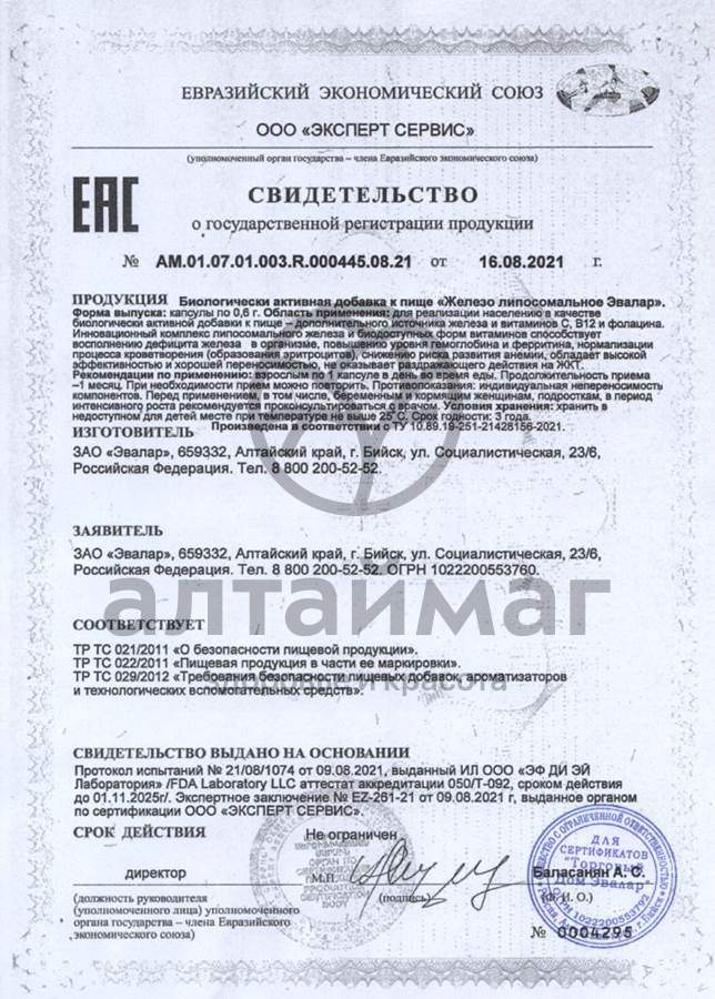 ЖЕЛЕЗО ЛИПОСОМАЛЬНОЕ ЭВАЛАР - Биологически активная добавка (БАД) к пище - Уникальная комбинация, необходимая для восполнения дефицита железа и повышения уровня гемоглобина и ферритинаДействие